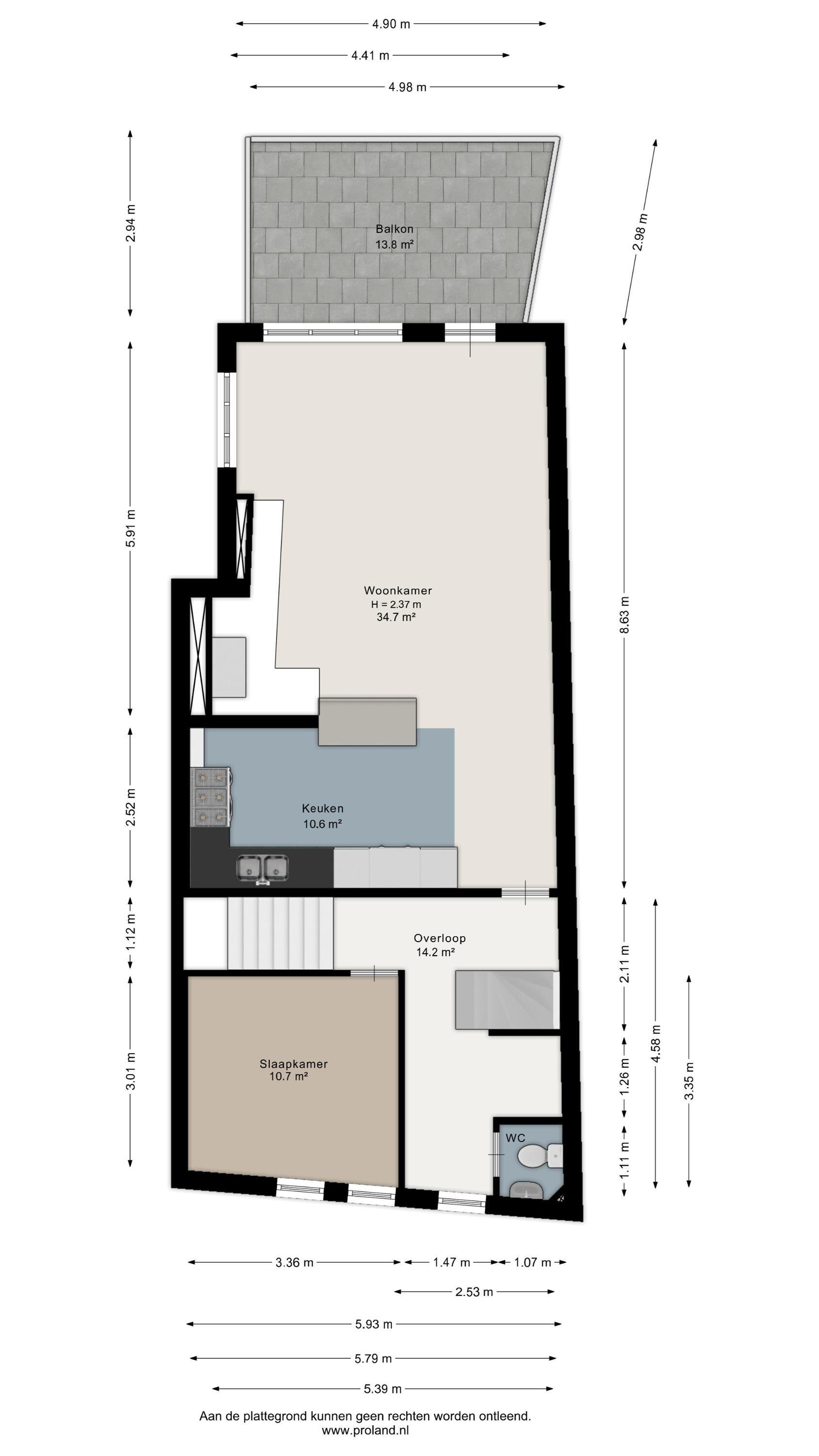 Op deze verdieping bevinden zich tevens een slaapkamer (circa 10.7 m²), een separaat toilet en de trapopgang naar de tweede woonlaag.